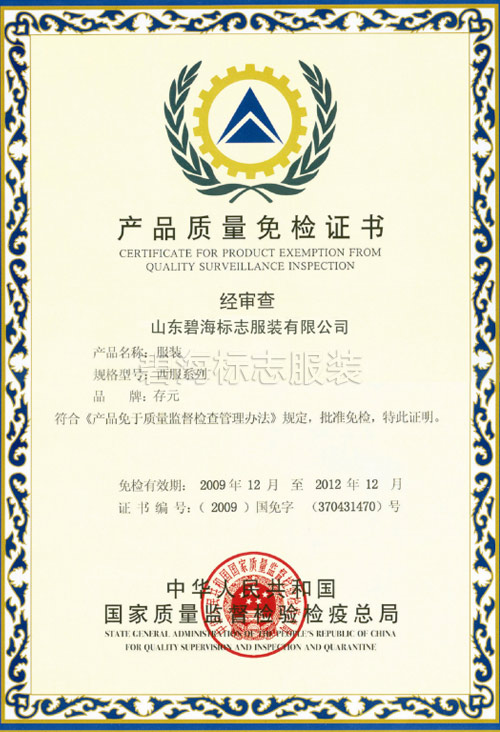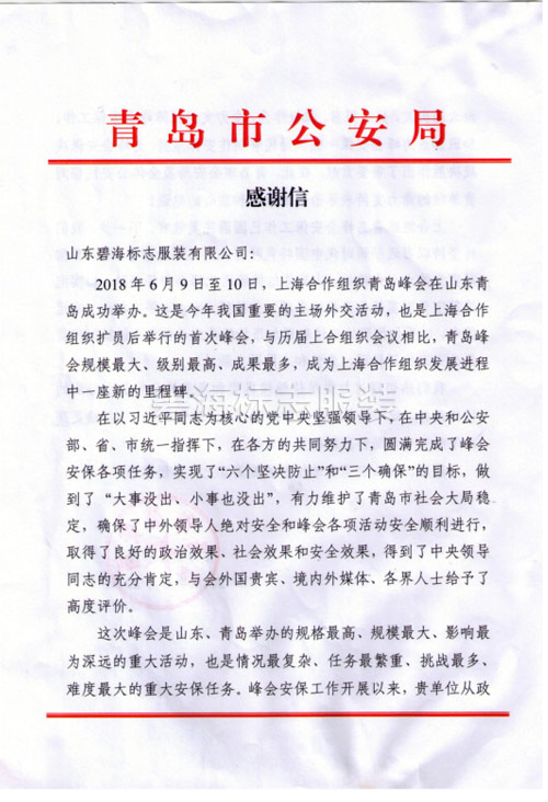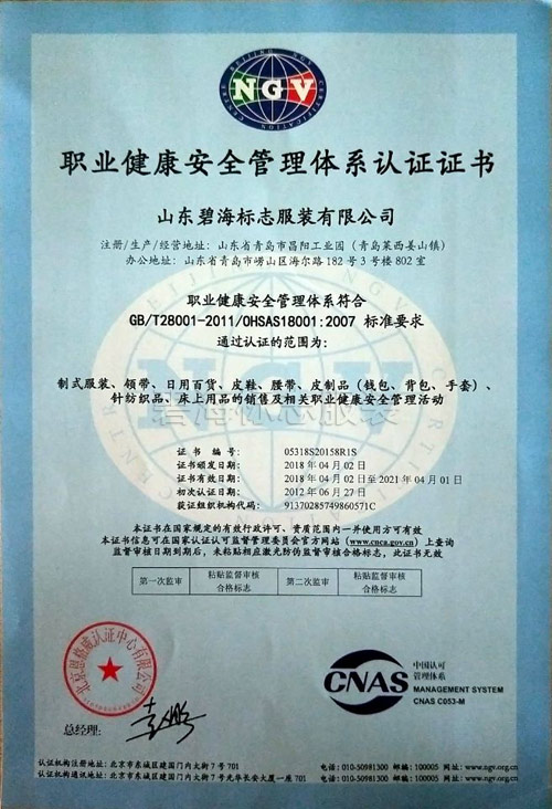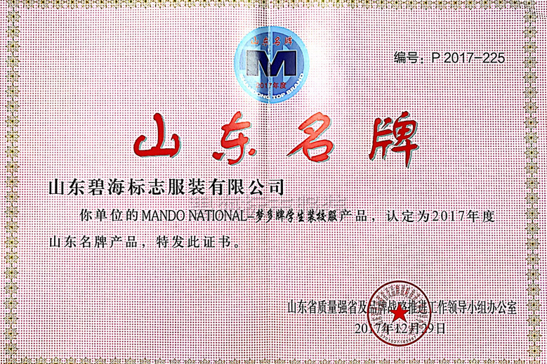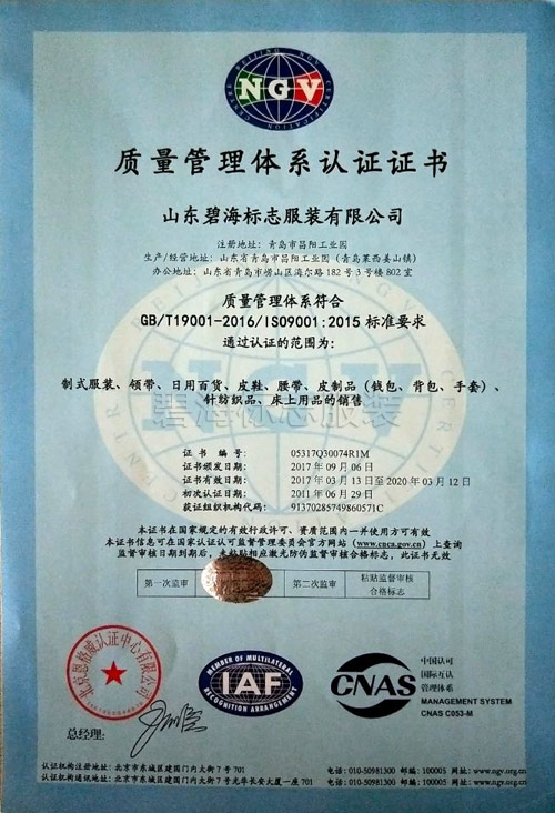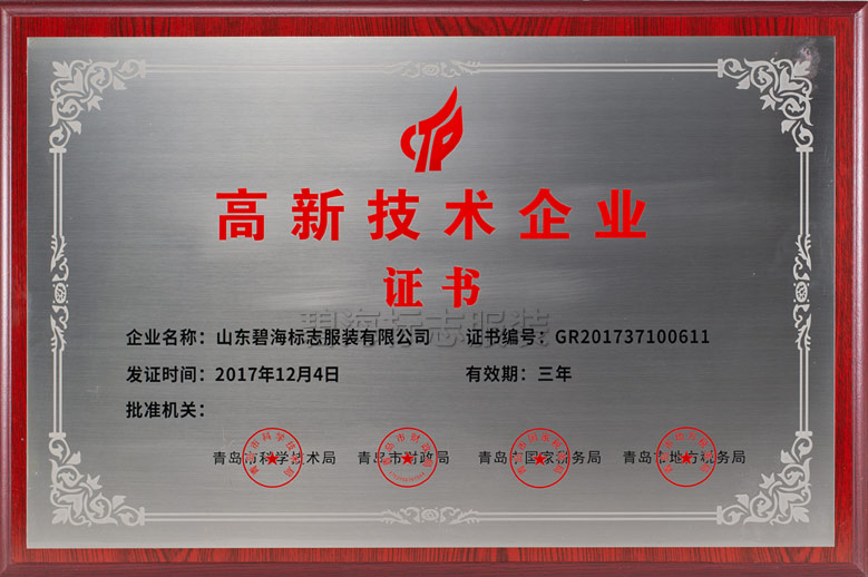 山东碧海标志服装有限公司(原山东省军工服装厂),创建于1985年。历经风雨,拼搏创业,2003年在青岛昌阳工业园建立新纺织加工园区,2010年为适应形势发展,于青海西宁建立西部工业园区,现已发展成为占地面积120000m2,建筑面积48000 m2,固定资产5600余万元,年产量100多万套,销售额达1.2亿元的大型标志服装、皮鞋、领带、皮具、家纺、床上用品的生产企业。