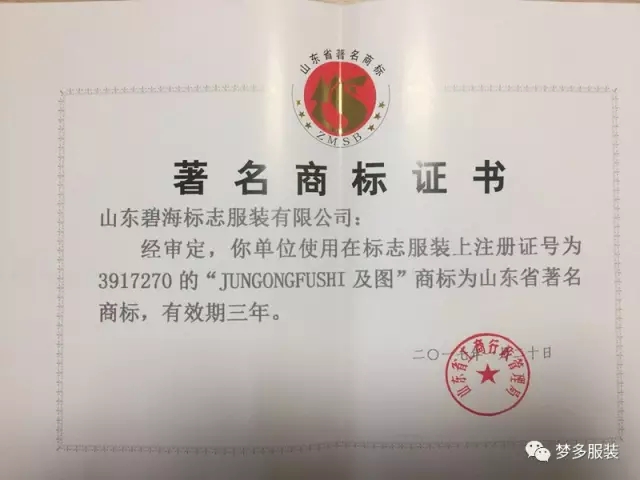 近日,山东碧海标志服装有限公司,正式被山东省工商行政管理局认定为“山东省著名商标”, 山东碧海标志服装有限公司是一家专业设计、生产、销售西装、标志服装、学生服装的大型服装生产企业。年生产量200多万套、件。生产基地配备了完善的先进服装制造设备,拥有国际一流的服装生产线。